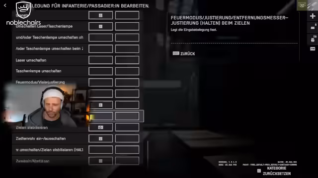 00:22:29Es folgt eine detaillierte Besprechung der Tastenbelegung, insbesondere für Gadgets und Slide-Mechaniken. Der Streamer erklärt seine Einstellungen (z.B. Bauchlage auf X, Klassengadget auf Alt) und optimiert die Steuerung für bessere Performance in Battlefield-Matches.