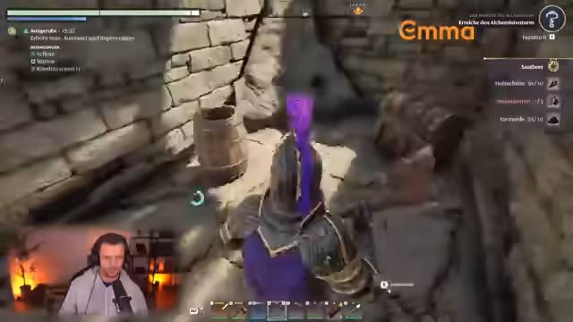 04:22:36Der Streamer beginnt, gemeinsam mit seinem Vater im 'Entshrouded'-Server zu spielen. Sie testen die Spielfeatures wie die Proximity-Stimme, die Lautstärke in Abhängigkeit der Distanz regelt. Es werden spielerische Elemente wie das Herstellen von Tränken, das Anziehen von Ausrüstung, das Interagieren mit NPCs und das Erledigen von quests gezeigt. Der Vater ist zunächst nur mit Lappen bekleidet, wird aber mit Ausrüstung versorgt.