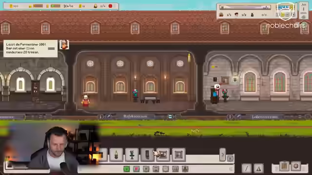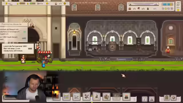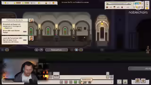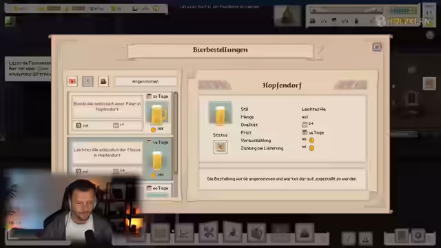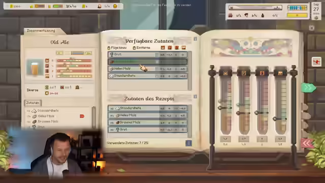 01:25:04Das Spiel wird als Management-Simulation beschrieben, in der das Kloster verwaltet, eigene Rezepte geschrieben und Bier verkauft wird. Die Qualität des Bieres Jockel ist jedoch niedrig, was zu finanziellen Problemen führt. Es wird versucht, die Trunkenheit der Mitarbeiter durch das Brauen neuer Biere zu beeinflussen, jedoch ohne großen Erfolg. Ein neuer Trend auf dem Markt wird entdeckt, der den Stil des leichten Ales bevorzugt. Es wird überlegt, eine weitere Braustation zu errichten, was jedoch zu teuer ist. Stattdessen wird versucht, durch kreative Kombinationen und den Einsatz mehrerer Zutaten die Bierqualität zu verbessern. Es gelingt, ein Bier mit hoher Qualität zu brauen, das im Keller gelagert werden muss. Eine neue Quest wird angenommen, die die Entwicklung eines Rezepts mit bestimmten Vorzügen erfordert. Es wird experimentiert, um die gewünschten Eigenschaften zu erzielen, und ein neues Ale namens Helen Ale wird entwickelt. Die Unwägbarkeit des Glocken-Events wird thematisiert, und es werden weitere Quests angenommen. Es stellt sich heraus, dass das Freigeben des Bieres im Keller manuell erfolgen muss, was zuvor übersehen wurde.