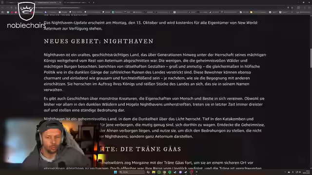 02:45:54Es wird die Season 10 Nighthaven angekündigt und kurz V-Rising erwähnt. Ein Zuschauer fragt, ob New World für Solospieler geeignet ist, woraufhin der Streamer empfiehlt, sich Leuten oder Gilden anzuschließen, um das volle Potenzial auszuschöpfen, aber man komme auch alleine gut voran. Es wird erwähnt, dass der Oktober episch wird und Biotech Factor empfehlenswert sei. Von Level 1 bis 65 könne man problemlos solo leveln, und zur Season 10 werden wieder mehr Leute in der Levelphase unterwegs sein. Das Update wird viele neue Sachen beinhalten und kostenlos sein, ähnlich wie Brimstone Sands. Leute, die New World Aeternum haben, haben Angry Earth bereits inklusive. Das neue Gebiet wird einen düsteren Touch haben, ähnlich wie in Van Helsing oder V-Rising. Es wird ein neues System von Mini-Dungeons geben, die prozedural generiert sind und an die Delves aus WoW erinnern. Diese Katakomben können mit bis zu drei Spielern gespielt werden. Es wird auch überlegt, ob es einen Arachnophobie-Modus geben wird.
