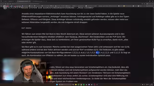 03:25:10Die Stufenbegrenzung wird von 65 auf 70 angehoben, der maximale Rüstwert von 725 auf 800. PvP-Body skalieren dann mit 775. Es gibt ein neues System zur Ausrüstungsmodifizierung namens Peak Charms, bei dem Ausrüstung bis zu vier leere Sockel haben kann. Die Anhänger gibt es in drei Typen: Defensiv, Offensiv und Fähigkeit. Die Anhänger können veredelt gefunden oder aus seltenen Materialien hergestellt werden. Es wird zum ersten Mal Setboni in New World Aeternum geben, die in den herausforderndsten Endgame-Inhalten erhältlich sind. PvP-Spieler werden nicht ausgeschlossen. Set-Boni gibt es in zwei Varianten: Manche werden bei zwei ausgerüsteten Teilen aktiv und verbessern sich bei vier, während andere erst bei drei Teilen aktiviert werden und sich bei fünf verstärken. Es gibt sieben mögliche Kombinationen von Setboni-Konfigurationen. Es liegt an den Spielern, die Kombination von Effekten zu wählen, die am besten zum individuellen Spielstil passt.