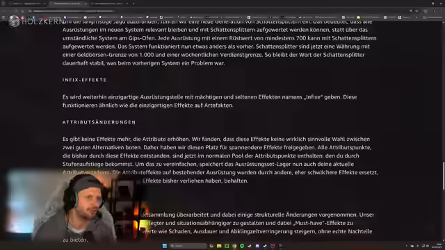 03:30:20Es wird eine neue Generation von Schattensplittern eingeführt, wobei die Frage aufkommt, was mit den bereits gehorteten Mengen passiert. Die Anzahl der benötigten Splitter soll reduziert werden, wodurch alle Ausrüstungen im neuen System relevant bleiben und aufgewertet werden können. Der Gipsofen wird als umständlich empfunden und könnte entfernt werden. Jede Ausrüstung mit einem Rüstwert von mindestens 700 kann mit Schattensplittern aufgewertet werden. Schattensplitter werden zu einer Währung mit einer Obergrenze von 1000 und einer wöchentlichen Verdienstgrenze. Es bleibt unklar, was mit überschüssigen Splittern passiert, die über dieser Grenze liegen. Infix-Effekte werden eingeführt, ähnlich den Effekten auf Artefakten, aber mit einzigartigen Eigenschaften. Ein Beispiel wäre ein Kopfteil, das bei Stillstand Unsichtbarkeit verleiht und bei Bewegung einen Boost gibt. Es wird spekuliert, ob diese Effekte auf einzigartigen Ausrüstungsteilen oder Set-Teilen angewendet werden könnten, was neue Anreize für das Sammeln von Gegenständen schaffen würde. Die Infix-Effekte sollen sich von den Artefakten unterscheiden und neue Anreize bieten, um sich auf bestimmte Gegenstände zu freuen, die Boni wie schnelleres Schwimmen, Reiten oder Abbauen ermöglichen.