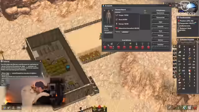03:14:01Herausforderungen wie Kälte (1°C) und Krankheiten der Ecopunks treten auf. Der Streamer reagiert, indem er ein Lagerfeuer baut und die Raumtemperatur reguliert. Er optimiert die Arbeitsprioritäten (z.B. Baumeister, Sammler), versucht eine Tür zu platzieren und erweitert das Lager. Diskutiert wird die Anfälligkeit der Strukturen bei Stürmen und die Notwendigkeit von Heizung/Kühlung, um Krankheiten (durch Temperaturabweichungen über 10°C/40°C) zu verhindern.