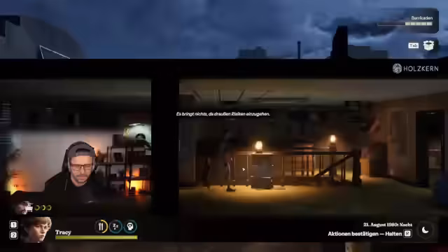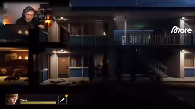 04:35:59Für den Start in 'Our Darkest Days' werden die Charaktere Tracy und Wayne gewählt. Tracy ist eine Aktivistin, die gegen Missstände im Pferdesport protestiert und sich in Wayne verliebt. Das Spiel beginnt in einem maroden Versteck, in dem Ressourcen knapp sind. Ziel ist es, ein neues Versteck zu finden und durch Plünderungen in feindlichen Gebieten (z. B. 38 Irving Drive) Überlebensmittel und Werkzeuge wie Dietriche zu beschaffen.