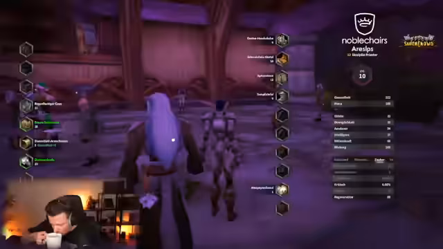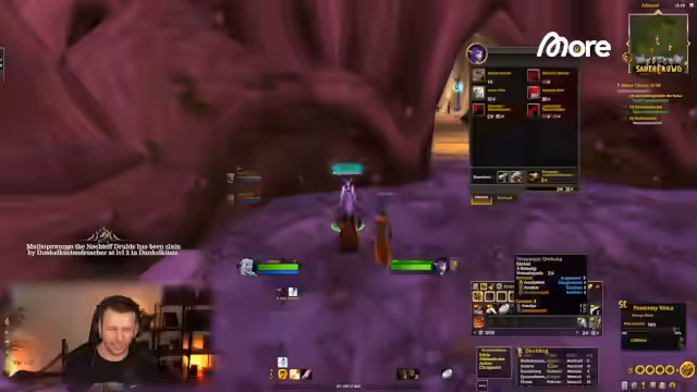 07:15:52Der Streamer levelt weiter und agiert als Facetank. Das Inventar ist voll, was das Farmen einschränkt. Er bufft Mitspieler wie Algana und Melanie. Es werden die Startgebiete für die Rassen behandelt, insbesondere die Nachtelfen, und es wird erklärt, dass die Spielwelten mit dem Schiff erreichbar sind. Es werden Berufe wie Schneiderei und Verzauberung anvisiert. Der Streamer erwähnt, dass Kalle ihn gerufen hat, was kurzzeitig Sorgen bereitet.