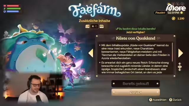02:51:12Nach einer Pause wird das Spiel 'Fae Farm' vorgestellt, ein Farm-Simulationsspiel mit magischem Element. Der Streamer hebt hervor, dass das Spiel im Gegensatz zu 'Luma Island' über eine Energielinie und ein begrenztes Inventar verfügt. Das Tutorial wird als nicht sehr aussagekräftig beschrieben, aber das Spielprinzip im späteren Verlauf als ansprechend eingestuft. Es wird erwähnt, dass das Spiel neben dem Solo-Modus auch einen Multiplayer-Modus für bis zu vier Spieler unterstützt.