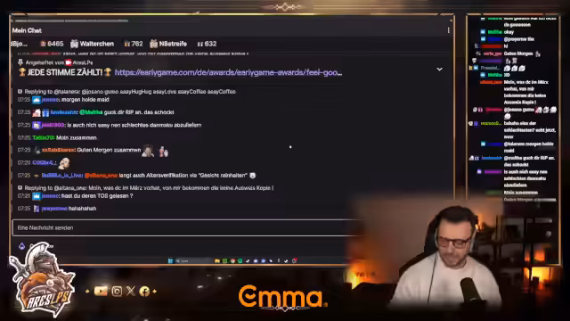 00:08:33Der Streamer startet den Variety-Content nach einer Pause und begrüßt die Zuschauer. Er erwähnt seine Vorbereitungen mit Kaffee, Essen und Snacks und bittet darum, die Runde zu vergrößern. Für das Voting zum Streamer of the Year wirbt er und fordert die Zuschauer auf, für ihn bei den Early Game Awards zu stimmen. Die Stimmabgabe sei alle 6-7 Tage möglich und erfolge über einen speziellen Link.