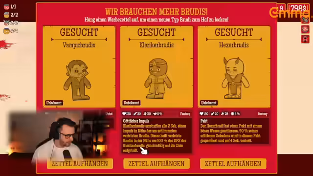 03:36:09Der Streamer beginnt mit der Vorstellung eines taktischen Rollenspiels, das starke Ähnlichkeiten zu 'Binding of Isaac' aufweist. Er erklärt die grundlegenden Mechanismen, einschließlich des Level-Systems, bei dem Einheiten nach einem Sieg Bonus-Attribute erhalten, sowie Fähigkeiten wie 'Rüstung', 'Heilung' benachbarter Einheiten und das Platzieren von Häufchen. Der Charakter 'Kevin' wird mit verschiedenen Fähigkeiten wie 'Maximum Pain' und 'Kurzer Schuss' ausgestattet. Es werden auch die Vorräte wie Futtermünzen, Gegenstände und Schätze erwähnt, die man aus Abenteuern mitnimmt.
