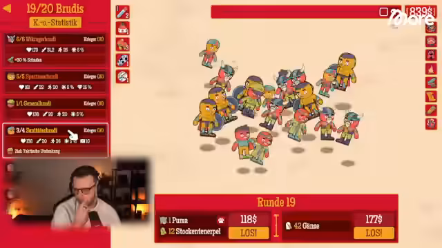05:00:35Der Streamer startet in ein Rundenstrategiespiel, bei dem es gilt, gegen immer stärkere Gegnerwellen zu überleben und Ressourcen zu farmen. Entscheidend ist die Wahl von synergistischen Builds und Helden, wie Spartaner zur Blockade von Angriffen oder Wikinger als Schadensquelle. Items wie Broody-Elixier und die taktische Umlenkung, die den Fokus der Gegner umleitet, sind entscheidend. Trotz starker Builds wie einem Necromancer-Bulli wird das Spiel nach Runde 113 beendet, da die Gegner den Rahmen der Demo-Spiellänge sprengen.