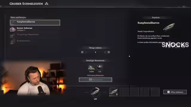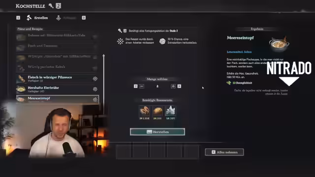 01:37:06Im Stream wird ausführlich über das Farmen von Ressourcen gesprochen. Der Streamer erklärt, dass bestimmte Bauten wie Reisendenlager farmbar sind und dort regelmäßig Ressourcen wie Kräuter, Farmerde, Mais und Maisaat spawnen. Besonderes Augenmerk wird auf Schießpulver gelegt, das nicht sofort verfügbar ist, sondern erst nach dem Abbau von Eisen und Schwefel hergestellt werden kann. Es gibt spezielle Orte wie Zeltlager, an denen man Schießpulver täglich farmen kann. Auch Blutungsrapier als Bossbelohnung wird erwähnt.