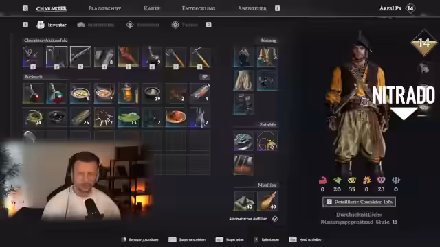 00:11:30Der Streamer erläutert detailliert das Stat-System von Windrose und betont die Bedeutung von Vitalität für das Endgame. Er erklärt, dass Attribute ab 20 Punkten einen abfallenden Schaden verursachen, während Vitalität konstant 10 Lebenspunkte pro Punkt gibt. Er zeigt seinen Champion-Ring und Halskette mit Ausdauer-Bonus, was Angriffe um 20% reduziert. Das Ausweichen und Blocken sind wichtige Mechaniken, die Ausdauer verbrauchen, aber richtig eingesetzt, erlauben längere Kämpfe. Er erwähnt auch die Schmuckwerkstatt, die Goldbarren, Silberbarren und Sumpfmetall erfordert.