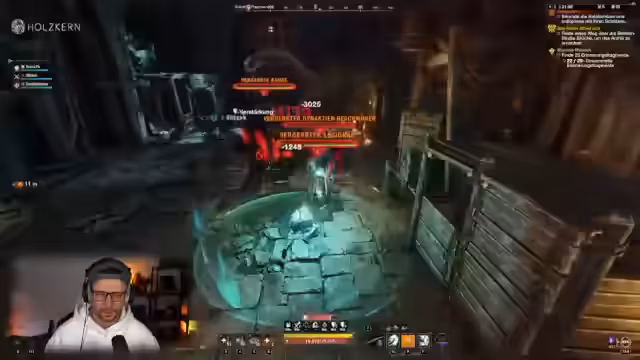 04:54:00Der Streamer und seine Gruppe betreten die Katakomben, eine zufällig generierte Instanz. Das Ziel ist es, innerhalb von 30 Minuten so viele Räume wie möglich zu absolvieren. Sie sammeln dabei die Währungen 'verfluchte Kronen' und 'verfluchtes Sterling' sowie 'zersplitterte Seelen'. Diese Letzteren können an einem Schrein gegen permanente Buffs eingetauscht werden. Die ersten Räume bestehen aus normalen Gegnern und einer Herausforderung, die es 30 Sekunden lang auszuhalten gilt.