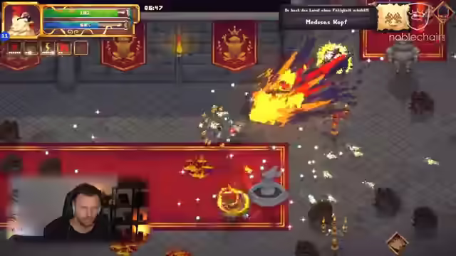 03:11:01Es werden Leben wiederhergestellt und der Flammenwerfer aufgewertet. Es wird Meteorit gespielt und Leben geholt. Es werden mehr Chicks geholt und ein weiteres Ei gefunden. Es wird überlegt, ob der Boomerang genommen werden soll. Es wird erwähnt, dass fünf oder sechs Spiele vorgestellt werden. Ein Kristall wird eingesammelt. Es wird durch das Spiel gedasht. Es wird ein Nest gefunden und weitere Eier erhalten. Es werden die Hühnchen gegrillt. Es wird überlegt, ob der Perk bei 50% HP noch aktiv ist. Es wird ein Brunnen gesucht und ein Goldfrosch entdeckt. Die Range-Typen werden ausgeschaltet und Medusas Kopf aufgewertet. Es wird ein Inferno-Flammenwerfer erhalten und ein Camp erreicht. Das Spiel wird durchgespielt und Medusas Kopf gewählt.