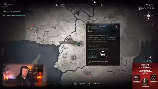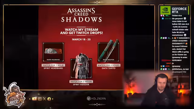 01:39:57Es wird Assassin's Creed ab 20:00 Uhr gespielt und parallel dazu ein Giveaway gestartet. Die Drops für Assassin's Creed laufen bereits, werden aber mit dem Start in der entsprechenden Kategorie aktiviert. Nach dem Waldläufer-Fate in Final Fantasy XIV, wechselt der Stream zu Assassin's Creed Shadows. Es wird die Grafik hoch eingestellt, um das Spiel in bestmöglicher Qualität zu präsentieren. Der Streamer hat verschiedene Versionen des Spiels, darunter eine Preview-Version, eine Pre-Order-Version und eine Collector's Edition. Er plant, das Spiel bis etwa 16:00 Uhr zu spielen und zwischendurch eine Pause für Toilette und Kaffee einzulegen. Ein Giveaway für Assassin's Creed Shadows wird gestartet, bei dem man sich eintragen kann. Es wird eine Collectors Edition von Assassin's Creed Shadows gezeigt, die dem Streamer zugeschickt wurde, inklusive einer Klinge, einem Artbook, einer Karte und einer Figur.