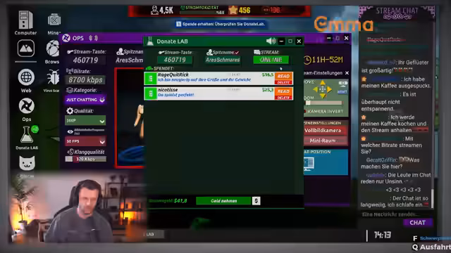 06:40:01Der Fokus liegt auf der Interaktion mit der Zuschauergemeinschaft. Der Streamer liest und beantwortet Spenden und Kommentare, wobei der Chat als sehr chaotisch und schnell beschrieben wird. Es werden Überlegungen angestellt, den Chat in einen Sub-Only-Modus umzustellen, was jedoch erst nach mehreren Versuchen erfolgreich umgesetzt wird. Der Streamer spricht die Zuschauer direkt an, thematisiert den anscheinend gutlaufenden Stream und bedankt sich für die Unterstützung, die zu einem stetigen Anstieg der Zuschauerzahlen auf über 300 führt.