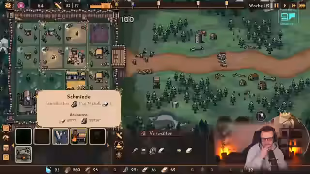 05:05:00Es werden verschiedene Gebäudeoptionen wie das Irrenhaus und die Feuerakademie in Betracht gezogen, und es wird überlegt, wo man das Irrenhaus am besten platziert. Das Irrenhaus produziert Wahnsinnige, die mit Ton und Weizen bezahlt werden. Eine Holzfällerei, die gleichzeitig Holz und Weizen produziert, wird als sehr nützlich empfunden und anstelle eines Baumes platziert. Es wird überlegt, ob man mehr Holz oder Weizen benötigt, und es wird entschieden, dass man Holz überproduzieren muss. Der Streamer spricht über seine Uhrensammlung und wie er beim Zocken immer wieder mal die Uhren abnimmt. Ein Bosskampf beginnt, und es wird versucht, die Soldiers überzuproduzieren. Ein Tornado verursacht heftigen Schaden, und der Boss wird betäubt. Es wird festgestellt, dass die Wahnsinnigen nicht so sinnvoll sind, und es wird überlegt, wie man auf Units gehen kann, die mehr Schaden machen. Der Boss wird schließlich besiegt, aber es wäre noch mehr möglich gewesen.