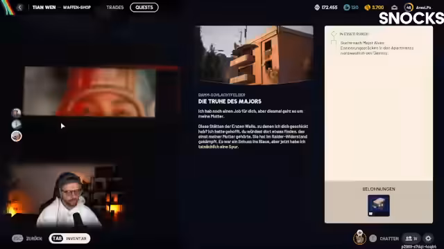 01:55:15Die Anzahl der freundlichen Spieler im Solo-Modus hat seit dem Wochenende abgenommen. Eine erhöhte Anzahl an Sonden ist für eine Stunde verfügbar. Es wird über den 'First Kill' von Tim Ninja Hatch gesprochen, obwohl es nicht der erste Kill war, wurde der Kill gesehen. Es gibt mehr Videos von Solo-Spielern, die oft in Gebäuden campen und mit dem 'Hullbreaker' aus dem Haus schießen. Der Streamer muss zur Truhe, um 'Major Ivers Erinnerungsstücke' in den Apartments nordwestlich des Damms zu finden, was die Vorquest für den 'Hullbreaker' ist. Es wird diskutiert, welche Quests die Spieler gerade absolvieren, darunter 'Gute Aufnahme', 'Augen im Himmel' und 'Marktkorrektur'. Es wird auch über das Sammeln von Wertgegenständen und Nahrung für Quests gesprochen, wobei 'Höhlenbrecher' als nützliches Item erwähnt wird. Die Möglichkeit, Waffen wie 'Anvil' und 'Venator' selbst herzustellen, wird ebenfalls thematisiert, wobei Magnete dafür benötigt werden.