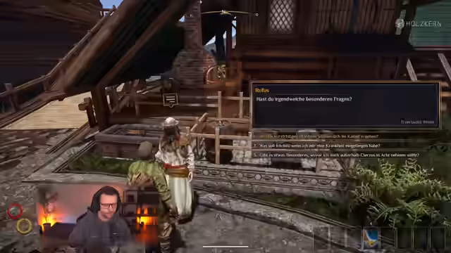 01:08:21Nachdem die Ausgangssituation mit den Schulden etabliert ist, beginnt die Spielfigur, die Umgebung zu erkunden und mit verschiedenen Charakteren zu interagieren. Es wird Holz gesammelt und überlegt, wie man durch Crafting und Verkauf von Gegenständen Geld verdienen kann. Ein Schwerpunkt liegt darauf, sich in der offenen Spielwelt zurechtzufinden und Quests anzunehmen. Es wird ein Ladenbesitzer namens Doran aufgesucht, bei dem Gegenstände gekauft und verkauft werden können. Doran bietet auch eine Quest an, ein Kassenbuch nach Berg zu bringen. Es werden weitere Dorfbewohner getroffen, darunter ein Heiler namens Lauthammer und eine Alchemistin. Ein Meisterkoch gibt eine Aufgabe, ein bestimmtes Gericht zuzubereiten. Es wird auch ein Katzenausbilder erwähnt, bei dem man Kampffertigkeiten erlernen kann. Das Ziel ist es, die Schulden zu begleichen und sich in der Spielwelt zu etablieren.