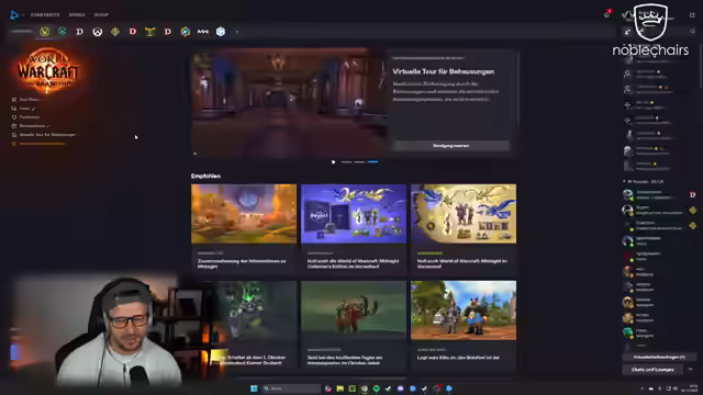 02:04:02Das Spiel wird gestartet und die Grafikeinstellungen werden angepasst, da ein neuer PC verwendet wird. Es wird überlegt, welcher Server und welcher Charakter gespielt werden soll. Es gibt viele Charaktere auf verschiedenen Servern, darunter ein Krieger, ein Schamane, ein Paladin, ein Schurke, ein Druide, ein Priester, ein Jäger, ein Hexenmeister und ein Todesritter. Zwerge werden als cool empfunden. Es wird über die verbesserte Charakteraufwertung gesprochen, mit der man einen Charakter auf 80 aufwerten kann. Es wird empfohlen, einen Dämonenjäger zu spielen, aber es wird auch gesagt, dass es jeder spielen wird. Housing startet im Dezember für Vorbesteller. Die Steuerung wird angepasst und das Maustempo wird reduziert. Die UI-Skalierung wird auf das kleinste eingestellt. Eine schattenhafte Einladung wird angenommen und der Raumgänger soll in Gründungshalle in Dornogal getroffen werden. Es wird nach Shortcuts gefragt und die Grafik wird neu eingestellt. Vertical Sync wird ausgeschaltet und verschiedene Antilizing-Optionen werden ausprobiert. Die Lautstärke wird angepasst. Es wird gefragt, wie es dazu kommt, dass WoW gespielt wird, und geantwortet, dass der Deep Dive von Midnight gesehen wurde. Ein Ereignis-Zeitplan wird gezeigt. Weltbosse und Weltquests werden hervorgehoben. Es wird überlegt, welche Quests angenommen werden sollen. Es wird versucht, ein Rätsel mit einem toten dornischen Hecht zu lösen. Es wird nach Verbänden gesucht, aber es gibt sie nicht mehr, da es jetzt Bandagen in Schneiderei gibt. Es wird nach einem Heilskill gesucht, um der Ratte zu helfen. Es wird ein Kochskill gefunden, der zur Genesung dient. Es wird festgestellt, dass man sich selber heilen kann, während man kanalisiert. Es wird vermutet, dass man den Fisch angeln muss, um der Ratte zu helfen. Es wird eine Quest angenommen, um die Jagd auf Xalatav aufzugeben und dem Raumgänger zu helfen. Es wird ein Film abgespielt und gesagt, dass morgen Preload bei Battlefield 6 ist. Die Katzenis werden als gut empfunden. Es wird gesagt, dass Housing am 3. Dezember startet, wenn man Vorbesteller ist. Aleria und der Raumgänger werden nach Tazavesh begleitet. Es wird gesagt, dass die Musik immer so filmreif ist. Es wird gesagt, dass die Hilfe des Spielers von entscheidender Bedeutung ist. Es wird gesagt, dass es in Tazavesh eine Krise gibt und die Probleme an den Spieler delegiert werden.