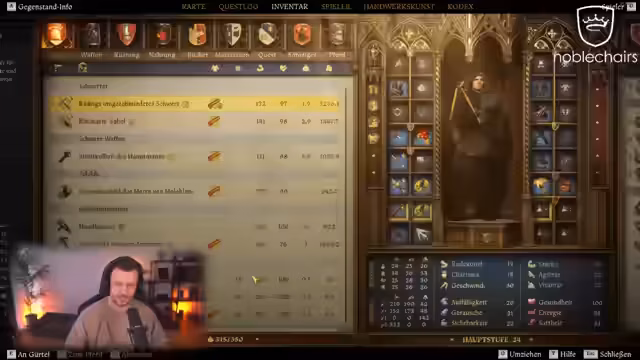 00:21:46Der Streamer beginnt mit einer Quest, bei der er Christian von Pisek sprechen und Beweise gegen Wawak beschaffen soll. Er bemerkt, dass Kuttenberg viele Quests hat, was für ihn überraschend ist. Er trifft auf NPCs und erfährt von der Alchemistengilde und deren Verfolgung. Der Streamer zeigt Interesse am Erlernen der Alchemie, jedoch wird ihm mitgeteilt, dass es nicht möglich ist, als Lehrling aufgenommen zu werden, da der Primus zu beschäftigt ist.