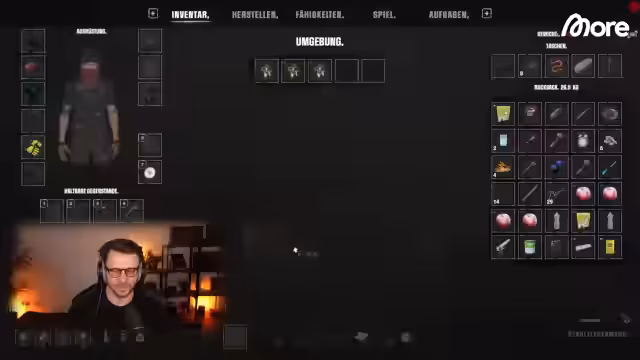 00:28:01Der Fokus verschiebt sich auf das Erlernen der grundlegenden Mechaniken. Nachdem der Streamer einen improvisierten Rucksack aus Fasern und Stöcken hergestellt hat, erweitert er seine Möglichkeiten. Er erkundet die Kirche und die Werkstatt, um Crafting-Rezepte zu finden. Das Erstellen eines Lagerfeuers wird gezeigt, das zum Kochen von Wasser und Fleisch genutzt werden kann. Auch die Jagd mit einem Jagdmesser und die Herstellung von Nahrungsmitteln wie Pökelfleisch werden demonstriert, um die Vielfalt des Survival-Gameplays aufzuzeigen.