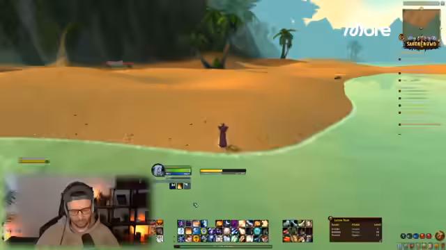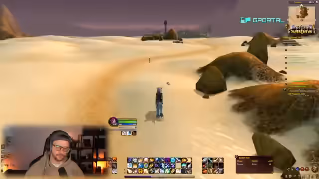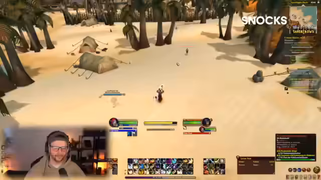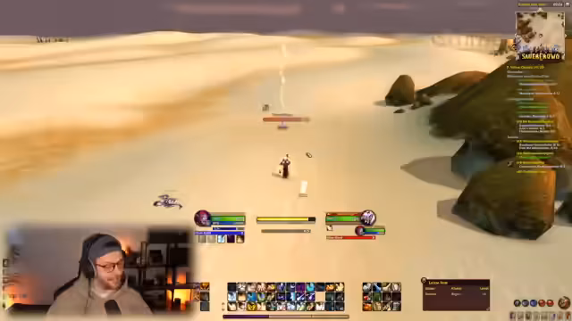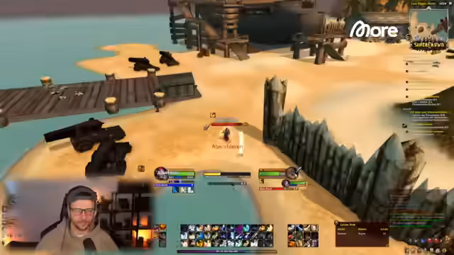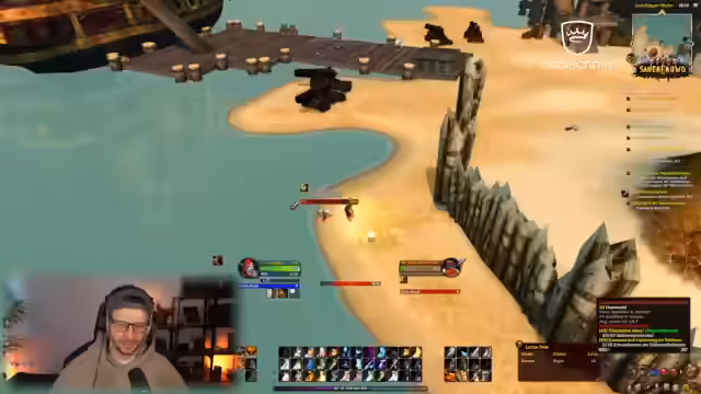 02:32:00Im Tal der Piraten unternimmt der Streamer riskante Kettenpulls, um die benötigten Dockarbeiter zu erledigen. Er muss dabei ständig sein Mana managen, Heilpotions und überlegtes Zurückweichen koordinieren. In einer akuten Notsituation, als er von mehreren Gegnern gleichzeitig angegriffen wird, gelingt ihm nur knapp das Überleben durch den rechtzeitigen Einsatz einer 'Light of Elune' und eines Mana-Potions, wobei er eine verpasste Heilung bedauert. Die Gegend bleibt hochgradig gefährlich, mit ständigen Respawns und unsicherem Gelände.
