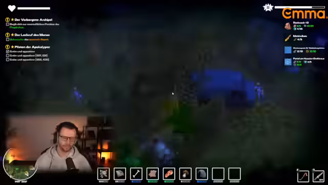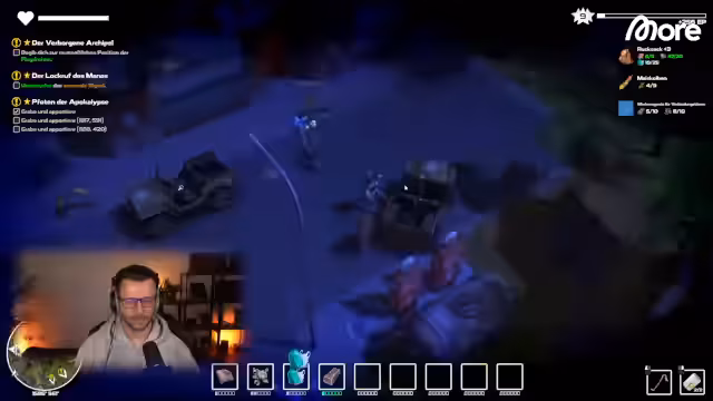 03:52:48Nachdem der Streamer erste Bauprojekte abgeschlossen hat, schaltet er neue Bereiche frei. Er baut Gartenbeete an, um Saatgut anzupflanzen, und fischt mit einer neu erworbenen Angel. Eine neue Herausforderung taucht in Form von Energieparasiten auf, die nachts erscheinen und entfernt werden müssen. Durch diese Fortschritte wird der Spielbereich stetig erweitert und der Platz im Rucksack durch eine Aufwertung größer.