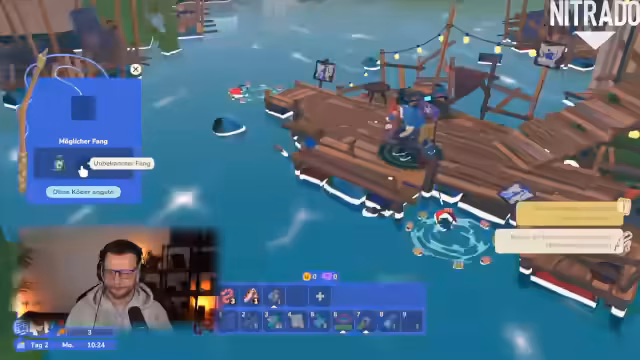 04:00:12Der Streamer nutzt den neu errichteten Angelbereich. Er fängt Fische mit verschiedenen Ködern und erhält im Gegenzug Tickets, mit denen man kosmetische Items wie neue Outfits und Helme freischalten kann. Dies motiviert ihn weiter zu fischen. Der Erzählstrang mit dem sprechenden Kühlschrap, 'Captain', wird fortgeführt, der dem Spieler Hunger vorgaukelt und so zum Kochen animiert.