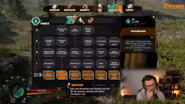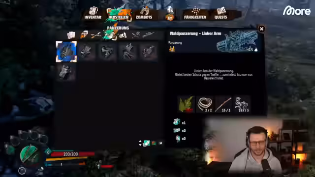 07:16:02Im Spiel wird der Charakter durch eine friedvolle Landschaft geführt, in der Zombies keine Bedrohung mehr darstellen, sondern als Hilfstruppen fungieren. Der Streamer steuert seine erste Zombie-Einheit an, kämpft gegen Gegner, sammelt Ressourcen wie Holz und Schrott und erstellt einen Hackinghelm. Das Gameplay besteht aus Kämpfen, Erkundung und dem Sammeln von Materialien, um Ausrüstung herzustellen.