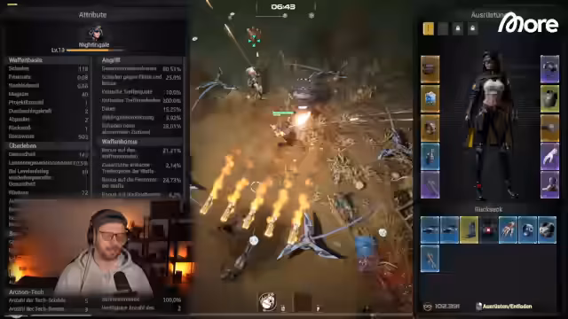 01:31:58Ein Early-Access-Spiel, das als Danmaku-Spiel mit einem belohnenden Aufwertungssystem und taktischen Fähigkeiten beworben wird. Der Streamer testet verschiedene Klassen, die sich mit unterschiedlichen Waffen wie Maschinenpistole, Schrotflinte und Raketenwerfer spielen lassen. Das Spiel bietet neben den Kämpfen gegen Bosse auch eine Metaprogression, die den Wiederspielwert erhöht. Das Gameplay wird als fair und die Animationen sowie das Trefferfeedback als gut empfunden, was die Immersion verstärkt.