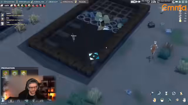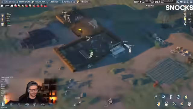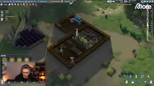 04:33:50Es wird mit der Errichtung einer Holzbasis begonnen, bestehend aus Wänden, Böden, Tür und Fenstern. Ein Reetdach und eine gerade Treppe komplettieren das Gebäude. Neben einem Lagerfeuer und einer Schlachtbank wird die Basisforschung priorisiert. Ein 5x5 großer Forschungsraum wird geplant, um Störungen durch Lärm zu vermeiden. Gleichzeitig wird die Erweiterung von Icarus erwähnt und ein Tagesplan für die Bewohner mit Freizeit- und Arbeitsphasen vorgestellt.