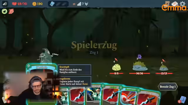 05:45:37Der Streamer beginnt mit einem Gameplay-Durchlauf von Slay the Spire 2, Akt 1 'Überwuchs'. Die Grundlagen des Kampfsystems werden erklärt: Spieler ziehen Karten, die Energie kosten, um Gegner anzugreifen oder sich zu verteidigen. Die Ressource 'Block' reduziert erlittenen Schaden nur für die aktuelle Runde. Die strategische Auswahl von Karten, wie die Anwendung von 'Verwundbar' für 50% mehr Schaden, ist entscheidend für den Sieg über Gegner und Elites.