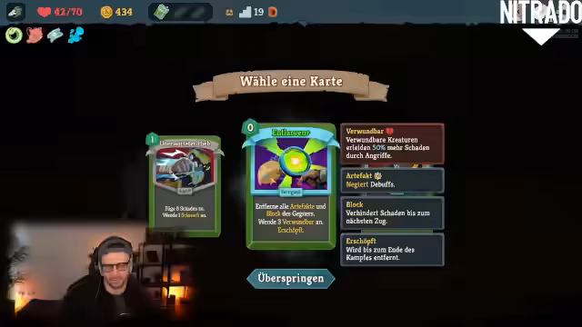 06:42:07Ein Elitengegner stellt eine erhebliche Bedrohung dar, da dieser nach Verlust von 'Block' betäubt wird und massiven Schaden verursacht. Der Streamer nutzt aktiv ein Artefakt, das ihn heilt und gleichzeitig seine Handkarten exhausted, um einen Extra-Zug zu erhalten. Das Artefakt 'Gestreifter Schlüssel' wird entscheidend, da es dem Gegner 'Block' entzieht, um ihn zu betäuben.