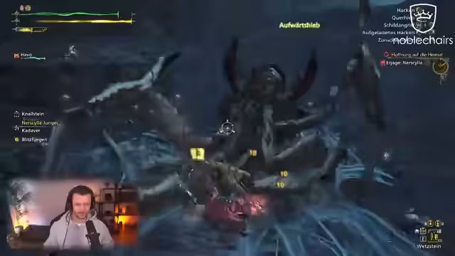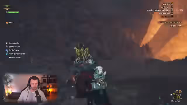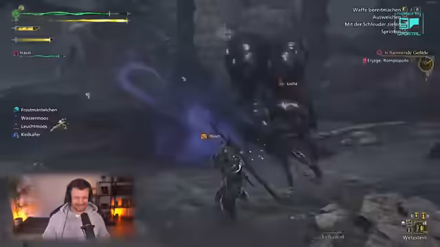 03:13:51In den flammenden Gefilden sucht der Streamer nach Marki und stößt dabei auf ein neues, aggressives Monster, ein Ölvolk. Dieser Gegner zeichnet sich durch Detonationen aus, die viel Schaden verursachen und das Gameplay verlangsamen. Der Kampf wird als besonders fies und herausfordernd beschrieben, da die Monster keine HP-Anzeige haben und der Spieler die Körperteile gezielt angreifen muss.