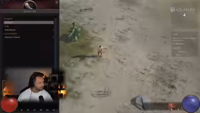 01:13:12Der Stream beginnt mit der Erkundung der Spielwelt und dem Bau einer ersten Basis. Es werden Ressourcen wie Holz und Erze abgebaut, während der Spieler von Kreaturen wie Ertrunkenen angegriffen wird. Fokus liegt auf dem Erstellen von Werkzeugen, dem Bau eines Daches zum Schutz vor Regen und der Sicherung der ersten Unterkunft. Dabei wird der Zustand von Werkzeugen, die sich abnutzen, und die Notwendigkeit bauen Materialien erwähnt.