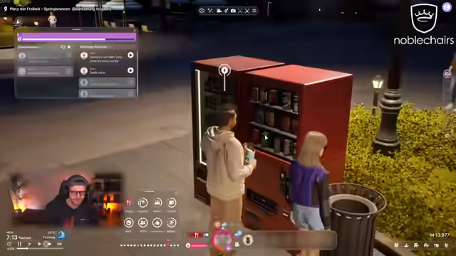 02:50:51Die Spielfigur trifft auf einer öffentlichen Bank in der Stadt auf eine Gruppe von Personen, darunter auch Deborah, und freundet sich schnell mit ihnen an. Die Streamer-Kommentatoren sind begeistert von der natürlichen Gruppendynamik. Ein bemerkenswertes Feature ist die Nachrichtenfunktion im Spiel: Deborah sendet der Figur eine SMS, die der Streamer selbst verfassen und verschicken kann. Die Interaktionen der NPCs untereinander wirken lebendig und unvorhersehbar. Währenddessen geht der Tag in der Simulation zu Ende, es wird Abend, und die Figur muss ihre Bedürfnisse wie Hunger und Hygiene weiterhin im Auge behalten, was den alltäglichen Charakter des Spiels unterstreicht.