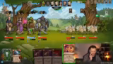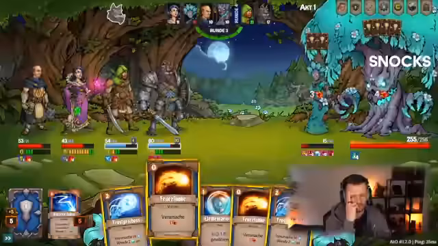06:03:31Nachdem die Gruppe die Helden ausgewählt hat (Magnus, Evelyn und Snow), beginnt ihre erste Runde im Abenteuermodus. Die Spieler lernen die grundlegende Mechanik des rundenbasierten Kampfsystems kennen. Jeder Spieler zieht Karten und kann sie mit einer bestimmten Anzahl von Energie-Punkten ausspielen. Es kommt zur Interaktion, wo Spieler gegenseitig KarteEmpfehlungen abgeben, aber die endgültige Entscheidung beim eigenen Zug liegt. Der Streamer erklärt die verschiedenen Symbole auf den Karten, die für die Schadensarten stehen, und wie man Karten aufdeckt.