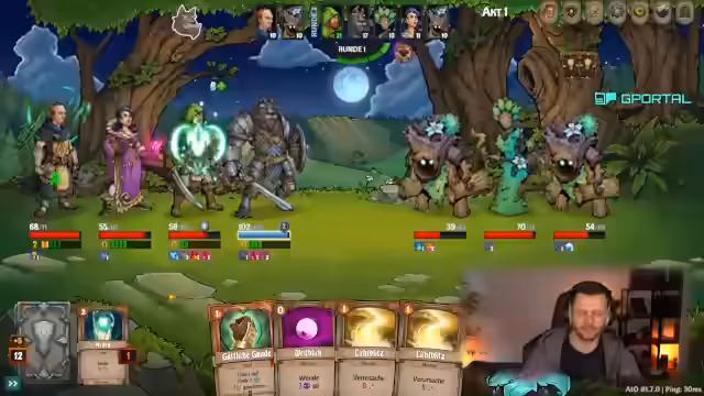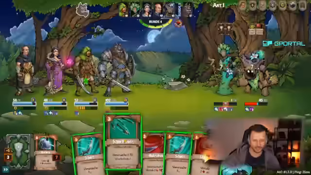 06:30:13Der Stream beginnt mit der Annahme einer Herausforderung in einem rundenbasierten Kampf. Die Gruppe erhält Zugang zu einem Aufwertungsaltar und der Held Andrin die Karte Camouflage kostenlos. Es werden die Werte der Gegner diskutiert, wobei der Fokus auf deren Initiative und Schadensresistenzen liegt. Der Streamer zieht Karten und erhält zwei Punkte, die er strategisch für Aktionen wie Schnellfeuer und wiederholte Angriffe einsetzt, um ersten Schaden zu verursachen.