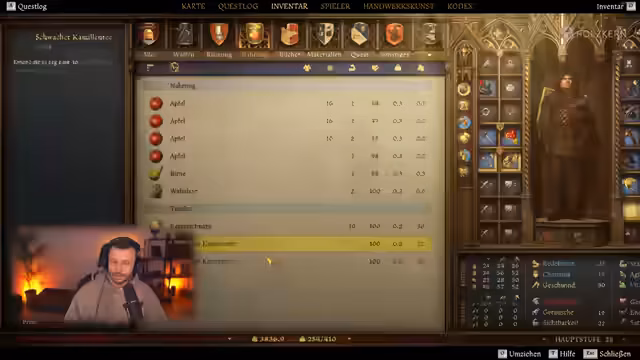 02:40:09Der Plan für das Finale nimmt Gestalt an. Godwin soll sich als Legat ausgeben, während eine andere Gruppe das Silber aus dem Welschenhof holen. Der Streamer trainiert mit Janosch wichtige italienische Phrasen für die Tarnung und stellt die Ausrüstung für den Einsatz zusammen, wobei es auch zu kleineren technischen Problemen beim Equipieren kommt.