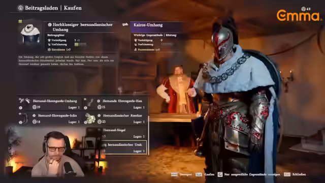 04:19:42Nachdem die Ausrüstung der Figur verfeinert wurde, wird der Blick auf die Ausrüstung des Pferdes gelenkt. Der Streamer kauft Heu und Würfelzucker für ein Pferd im Stall und erwägt, eine Hasenledermaske herzustellen, die Blitzresistenz gibt. Es wird eine Blutbanditenverkleidung erwähnt, die ebenfalls Vertrauen bringt. Die Diskussion über die Möglichkeit, Helme zu verbergen, wird gestartet, da eine Helmmaske wie die Hasenledermaske nicht immer optisch ansprechend ist. Das Craften und die Veredelung von Gegenständen nehmen weiterhin viel Zeit in Anspruch.