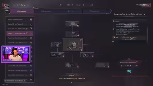 01:41:13Es wird über einen Kampfstab gesprochen, den der Streamer aufsammeln kann. Das Lithographiebuch wird erwähnt, mit dem man Ressourcen oder Pläne zum Craften besonderer Bögen erhalten kann, indem man nicht mehr benötigte Items einschmilzt. Es wird erklärt, wie man gezielt Items farmen kann, indem man im Spiel nachschaut, woher man die benötigten Items bekommt. Der Streamer schließt Kapitel 4 ab und wählt zwischen einem Ring und einem Gürtel als Belohnung. Es wird empfohlen, regelmäßig das Inventar zu überprüfen, da sich dort immer wieder Truhen finden. Der Streamer wählt schwere Rüstung als Belohnung. Es wird über die Klamotten der Zuschauer gesprochen, darunter ein Spitzhut mit einer Robe oder eine Kultisten-Wahrsagerei-Kutte. Der Streamer stirbt zweimal, weil er zu lange zum Aufleveln braucht. Es wird gefragt, wer die Glebe (Hellebarde) spielt, und der Streamer erwähnt, dass er überlegt hat, Magier zu spielen, da er schon lange keinen Mage mehr in MMOs gespielt hat. Es wird in die Runde gefragt, welche Klassen die Zuschauer in RPGs oder MMOs bevorzugen.
