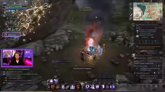 01:14:19Es wird darauf hingewiesen, dass man auf die Ausdauer achten muss, da man sonst nicht mehr parieren kann. Es wird erwähnt, dass man mit der Kugel eine gute Distanz zum Gegner hat und viel Schaden verursacht. Die Frage wird in die Runde geworfen, wie die Spieler mit den Kugeln zurechtkommen. Es wird erklärt, dass man die Fähigkeiten immer wieder austauschen kann und dass man sich später auf eine Maximierung spezialisieren sollte. Es wird erklärt, wie man die Fähigkeiten mit Wälzern aufwertet und wie man alte Gegenstände einschmelzen kann, um die Aufwertungen auf neue Gegenstände zu übertragen. Es wird erwähnt, dass es überall Spinnen gibt und dass dies eine Triggerwarnung für Leute mit Arachnophobie ist. Es wird erklärt, wie man den Zeitplan für Events auf der Map einsehen kann. Es wird erklärt, dass man Sternenstaub sammeln und zu den Feuerwerken bringen muss, um an einem Event teilzunehmen.