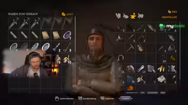 06:13:49Der Streamer findet im Holzfällerlager verschiedene Gegenstände wie ein altes Kurzschwert, Nägel, frisches Brot mit Kartoffeln und Tränke. Er hört Musik und entdeckt eine Werkbank, kann aber noch nichts Neues nutzen. Er findet eine alte Axt, die er verkaufen kann, und hört Käfer in der Nähe. Da Gegner draußen sind, kann er das Lager nicht plündern und kümmert sich zuerst um die Käfer. Er besiegt einen Käfer und bemerkt die coole Atmung im Spiel. Er schläft bis zum Morgen, um sich auszuruhen und speichert das Spiel. Er fragt sich, wie man Lockpicks lernt und vermutet, dass Liz, der Dieb, dabei helfen könnte. Er findet mehrere Äpfel und bemerkt, dass er Durst hat. Er hat 465 Gold gesammelt und entdeckt eine Notiz, die nach Alkohol riecht, von jemandem, der in einem Gitter feststeckt. Er wäscht sich, was nur die Sauberkeit verbessert, aber keine anderen Werte. Er findet weitere Äpfel, altes Brot und Gewürze. Er kann Fische zubereiten und Fleisch kochen. Er findet einen Silber-Kerzenhalter und eine Münze, die er nicht nehmen darf. In einer Truhe findet er einen Schlüssel und ein Eisengeschicklichkeits-Amulett, das seine Geschicklichkeit um vier erhöht. Er fragt sich, wie er seinen Durst stillen kann, da er trotz Schlaf immer noch erschöpft ist. Er findet einen Ausdauertrank und ein Buch, „Die Geschichte des Grauen Hauchs“, das ihm 200 Erfahrungspunkte gibt. Er entdeckt einen Streitkolben und eine Handkeule. Er versucht, seine Waffe zu wetzen, indem er in die Richtung des Pfeils guckt und Kraft anwendet, um sie zu schleifen und dadurch zu verbessern.