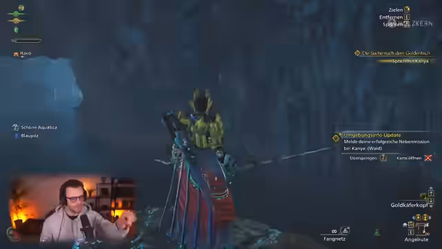 00:35:55Der Streamer verfolgt ein Monster, das plötzlich verschwindet, und entdeckt territoriale Kämpfe zwischen verschiedenen Kreaturen, darunter eine Spinne. Er kämpft gegen die Spinne, wobei er feststellt, dass sie Story-relevant ist. Er wechselt zwischen Schwertschild und Doppelklingen, um den Kopf der Spinne zu treffen und Materialien abzubauen. Er erklärt, dass er auf Maus und Tastatur umgestiegen ist, nachdem er die vorherigen Teile mit dem Controller gespielt hat. Er schließt eine Quest ab und gibt sie bei Kanya ab, wobei er eine Folgequest vermutet. Er fängt einen Sushi-Fisch und erklärt, dass er Lego-Rüstungen erst später anlegen kann. Er gibt Tipps zur Steuerung mit Maus und Tastatur, insbesondere den Fokus-Modus. Er versucht, einen Goldfisch zu angeln, stellt aber fest, dass es verboten ist. Stattdessen fängt er einen Grünschlammfisch und nimmt diesen mit. Er schließt eine Sidequest ab und stellt seine Katze auf Miauzen um.