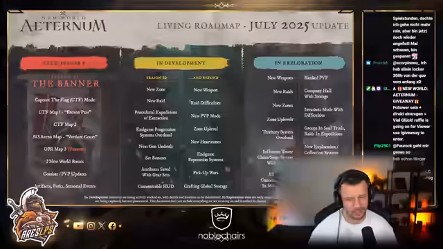 04:27:06Der Stream startet ein Giveaway für New World Aeternum inklusive DLC. Follower können sich mit einem '!'-Zeichen eintragen. Gleichzeitig wird die Roadmap für New World vorgestellt, besonders mit Fokus auf Season 9 und die kommende Season 10. Der Streamer äußert, dass Season 9 mehr für PvPler gedacht ist, während Season 10 für PvEler wieder interessanter wird. Er betont, dass New World trotz weniger aktu Spieler weiterhin Unterstützung braucht und dass die Performance und Grafik im Spiel verbessert wurden.