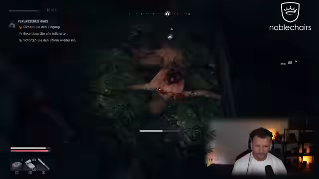 03:25:21Es wird geklärt, dass das Claimen von Drops über Twitch möglich ist, aber die Verbindung zwischen den Konten noch nicht funktioniert. Der Spieler ist in einen Spalt gestürzt und muss sich erneut orientieren. Ein Jäger wird gesichtet, und der Spieler muss vorsichtig sein, um nicht entdeckt zu werden. Ein Monster wird als 'Kumpel' bezeichnet, da es andere Monster töten kann. Eine UV-Lampe wird gesucht, aber stattdessen eine Granate gefunden. Es wird überlegt, ob der Lärm weitere Monster anlockt. Die Jagd beginnt, und die Monster versuchen, in das Gebäude einzudringen. Die Nacht war heftig, bringt aber doppelte XP, jedoch auch zehnfachen Stress. Der Biesmutter-Modus wird als nützlich empfunden. Der Spieler sichert den Eingang und bemerkt die krassen Animationen und das Nachtreten. Ein Kotzer wird gesichtet, und der Spieler wird elektrifiziert.