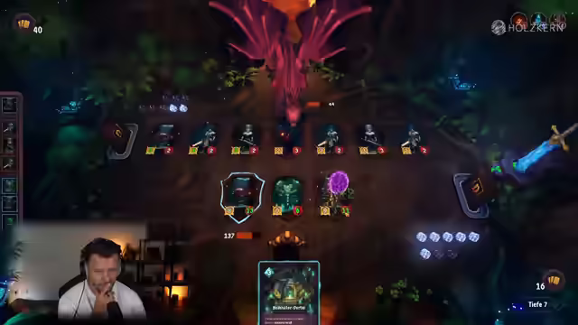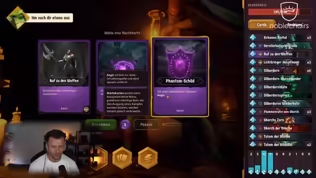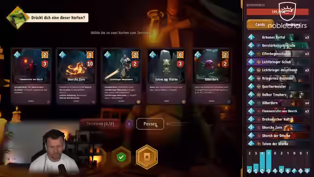 04:20:59Es wird über die Metaprogression in Doomspire gesprochen, bei der Karten möglicherweise in zukünftige Durchgänge übernommen oder neue freigeschaltet werden. Der Streamer zeigt sich gespannt auf den Fortschritt und die freischaltbaren Inhalte. Es wird eine neue passive Karte namens Totemaurer gewählt, und die Icons der Karten werden als schön gezeichnet gelobt. Der Streamer entscheidet sich gegen Feuerkarten und wählt stattdessen das Skelett. Es wird über den Fehler diskutiert, Scorch zuvor nicht gewählt zu haben, weshalb er nun wieder ins Deck aufgenommen wird. Der Streamer experimentiert mit verschiedenen Kartenkombinationen und Builds, wobei der Fokus auf Lightbringer-Karten liegt. Es wird auch überlegt, wie man das Deck am besten clearen kann, um nicht zu viel Schaden zu erleiden. Der Streamer betont die Bedeutung von Kartenziehen und Mana-Management, um im Spiel erfolgreich zu sein. Es wird auch überlegt, welche Karten man zerstören sollte, um das Deck zu optimieren.