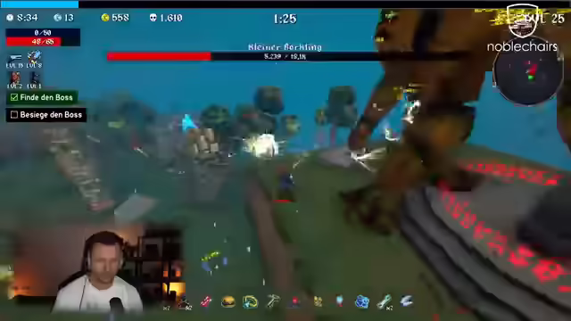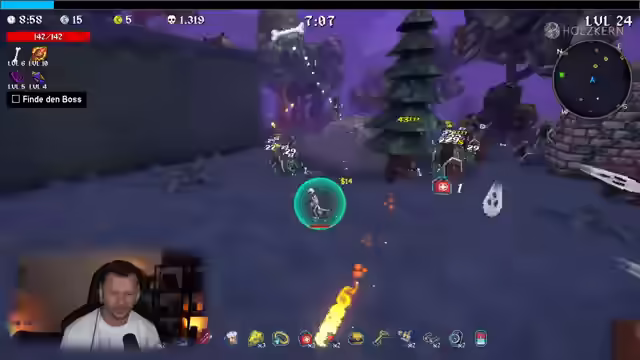 01:16:22Der Streamer findet weitere Truhen und bereitet sich auf den Bosskampf vor, stellt jedoch fest, dass er nicht genügend Schaden verursacht, ist aber vom Brandschaden beeindruckt. Er nutzt einen Freeze-Effekt und geht zum zweiten Level über. Unterwegs sammelt er XP-Zuwachs und öffnet weitere Truhen. Der Fokus liegt auf dem Farmen von Ressourcen, um Truhen zu öffnen, wobei Gold als willkommene Belohnung betrachtet wird. Es werden Events absolviert und Schreine genutzt, um die Schwierigkeit zu erhöhen und zusätzliche Truhen zu öffnen. Der Streamer nimmt an einer Challenge teil, bei der er gegen eine Elite kämpft, und versucht, Erfahrungspunkte zu sammeln. Ein Zwischenboss erscheint, und der Streamer muss auf seine Umgebung achten, um nicht in der Nähe des Schreins Schaden zu nehmen. Er kämpft gegen einen Schweineboss und versucht, ihn mit Gift und Feuer zu besiegen, wobei er die Notwendigkeit eines direkten Angriffs betont.