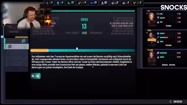 04:07:53Nachdem er sich für den 'Überlebenskampf'-Schwierigkeitsgrad entschieden hat, beginnt der Streamer mit dem Tutorial von Star Trek Across the Unknown. Er kontrolliert Captain Janeway und ihre Crew, die nach einem Unfall im Delta-Quadrant stranden. Die anfängliche Aufgabe ist es, das beschädigte Schiff zu reparieren, Deuterium zu sammeln und das Schicksal der vermissten Marquis-Crew aufzuklären. Der Streamer erforscht die Menüführung zur Verwaltung von Ressourcen, Energie und Crewmitgliedern.