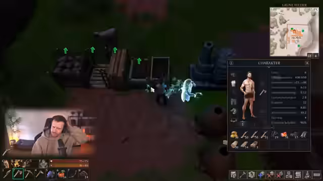 10:35:22Es wird in einem Dungeon weitergekämpft, indem Tränke gesammelt und Waffen wie ein Stab, eine Axt sowie Handschuhe ausgerüstet werden. Nachdem man durch die Krypta gezogen und einen Boss mit nur einem Prozent Trefferwahrscheinlichkeit besiegt hat, wird das Inventar neu sortiert und ein besserer Bogen für 9-15 Schaden entdeckt. Es gibt auch Talk über den Stream selbst, der seit 6 Uhr läuft und mit Giveaways gespickt ist, um die Zuschauer zu unterhalten.
